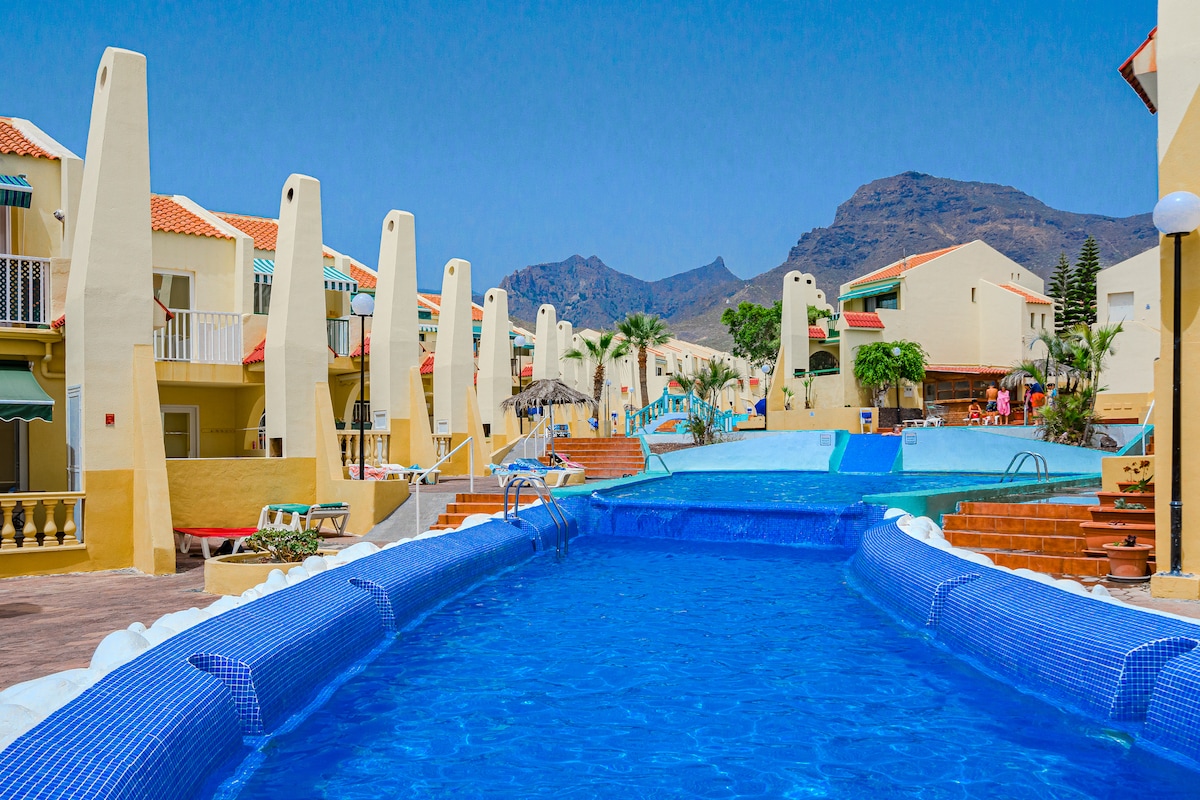 Fantastic new, private and very quiet apartment with 2 swimming pools, it is 4 minutes from the wonderful white beach of La Pinta, next to Puerto Colon, surrounded by shops, restaurants, bars, 600 meters from the Siam Park water park The apartment has a room with 2 single beds, a living room with a sofa bed for 2 people, a new and fully equipped kitchen and a bathroom with a shower, a terrace with beautiful views of the pool, ideal for families.