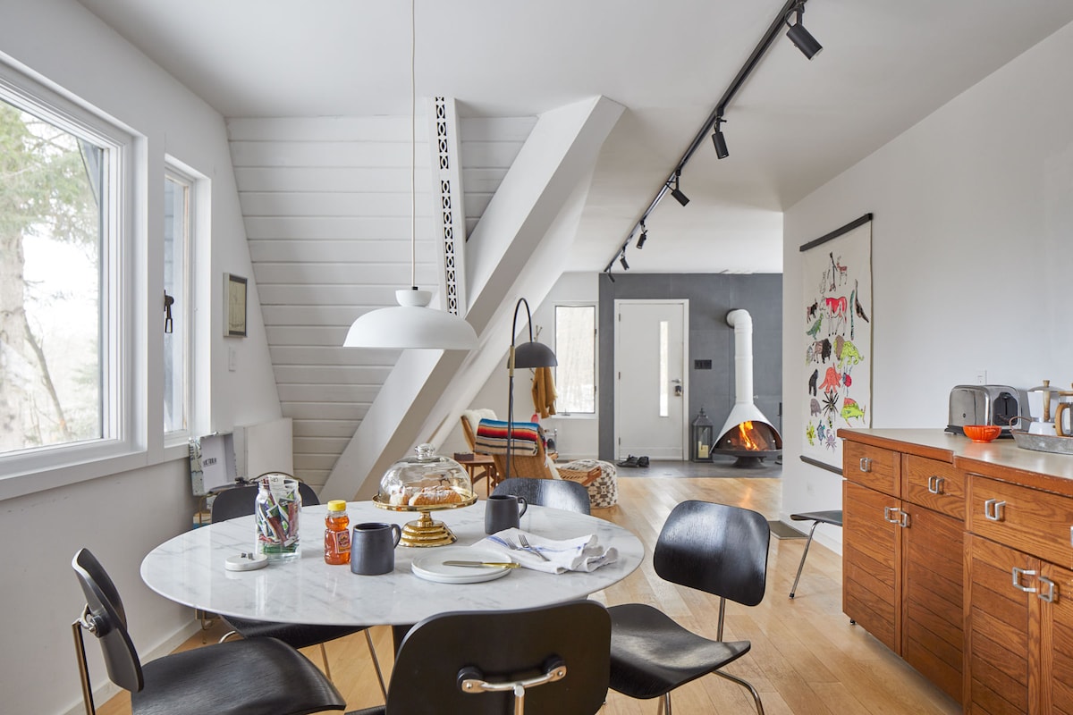 As seen in Vogue, Domino, Hudson Valley Magazine, and more. NightFox A-Frame is an all-black, architecturally significant cabin located in the Western Catskills hamlet of Livingston Manor. With the local area known for foodie-centric dining experiences, breweries, fly-fishing, hiking, and more, this year-round, 2-bedroom stay is the perfect escape from the city. The a-frame is known for its interior style, with a focus on Scandinavian comfort with 70s mod influence. @nightfox_aframe