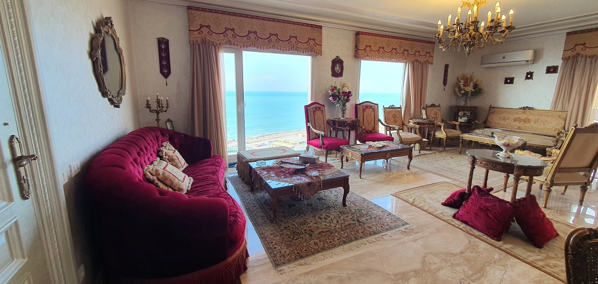 Εκπληκτικό διαμέρισμα 3 υπνοδωματίων με θέα στη μαγευτική Μεσόγειο Θάλασσα στην καρδιά της Αλεξάνδρειας. Κλιματιζόμενο και πλήρως επιπλωμένο. Υπέροχη ευρύχωρη βεράντα με τραπέζι 4 θέσεων. Δύο δωμάτια μπορούν να δουν καθαρά τη θάλασσα ακόμα και αν είστε ξαπλωμένοι στο κρεβάτι και το τρίτο βλέπει σε ένα φαρδύ δρόμο. Ό, τι μπορεί να χρειαστείτε είναι κοντά, δύο λεπτά με τα πόδια στη διάσημη Khalid Ibn Al-Waleed Street. Μπορούμε να κανονίσουμε να σας παραλάβουμε από το αεροδρόμιο με κανονικούς ναύλους.