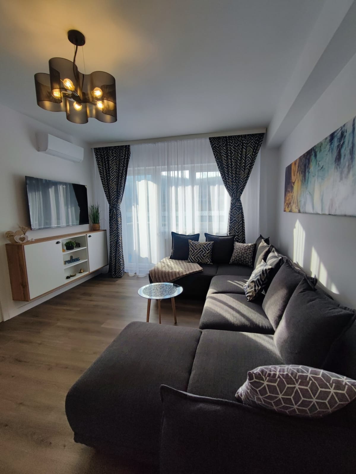 Cozy and relaxing apartament with a great view. The place has a minimalistic design and elegant details .It has all the appliances and devices that you expect in your home. With a 5 minute walk to the local shops and 10 minutes to the local bus station . We offer on site free parking. We also ofer air conditioning for a smal extra fee .