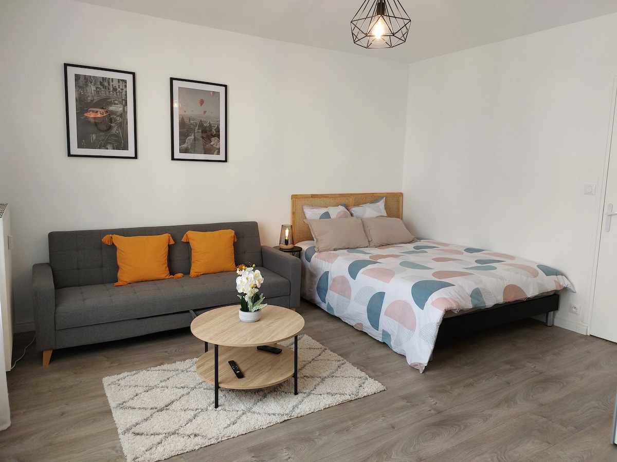 Studio 20m2 entièrement rénové, tout équipé. Le studio : - Le coin salon: canapé convertible (140cm x 200cm), télévision led connectée, plafond équipé d’un bandeau led et d’une enceinte Bluetooth encastrée. - Le coin cuisine: four, plaque de cuisson double, micro-ondes, réfrigérateur, cafetière Senseo. Service vaisselle complet et ustensiles de cuisine (poêles, casseroles…). La salle de bain: Douche italienne, dressing et sèche serviette. Drap, couverture, oreillers, serviette de bain fourni.