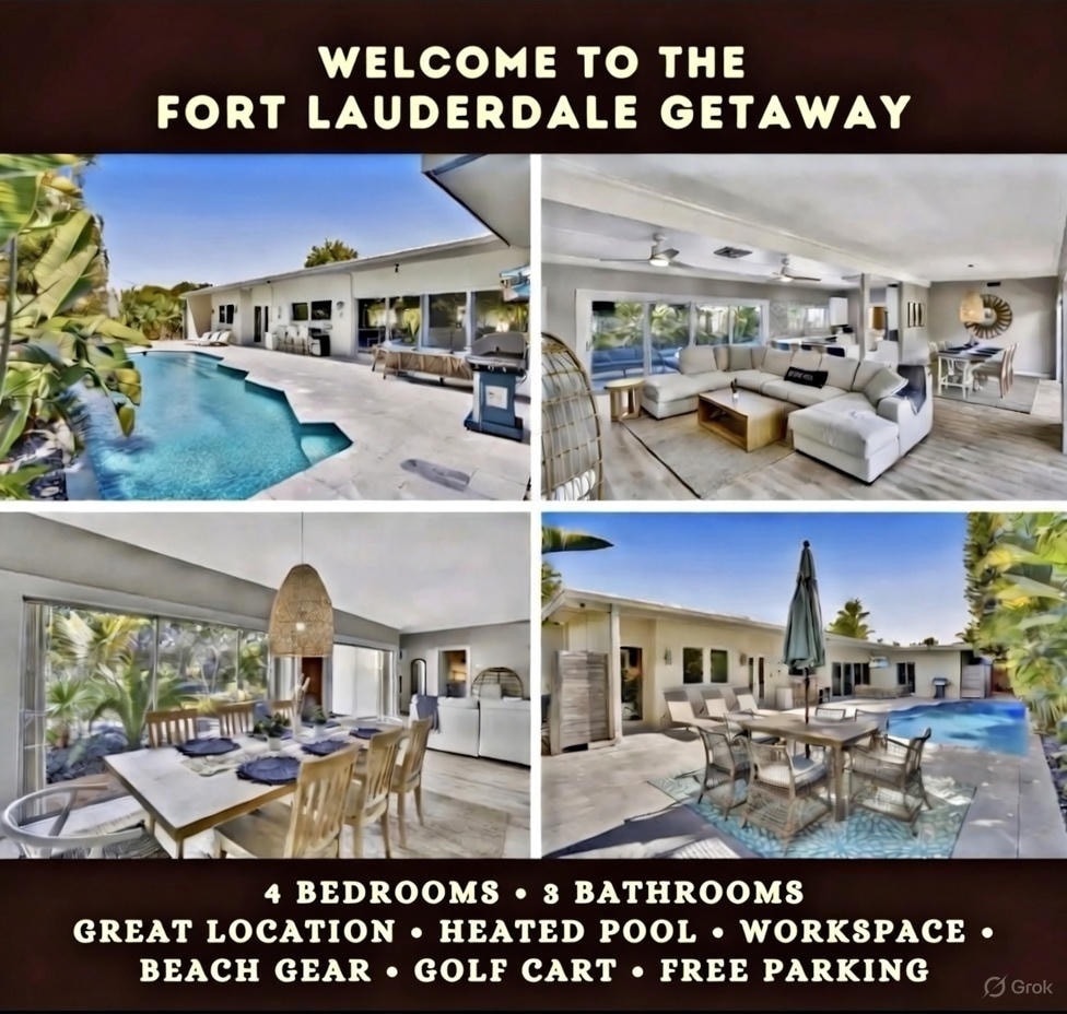 Discover South Florida from this luxurious 4-bedroom 3 bathroom newly renovated coastal beach home in Fort Lauderdale! Open-concept layout, a spacious living area, and plenty of natural light, this beautiful home is the perfect getaway for large groups of friends or family. Beach and pool essentials provided! Grill out in the amazing private back yard! 3 Min Golf Cart ride to Point of Americas Beach Access 9 Min Drive to Downtown 5 Min Drive to Fort Lauderdale 5 min drive to convention center