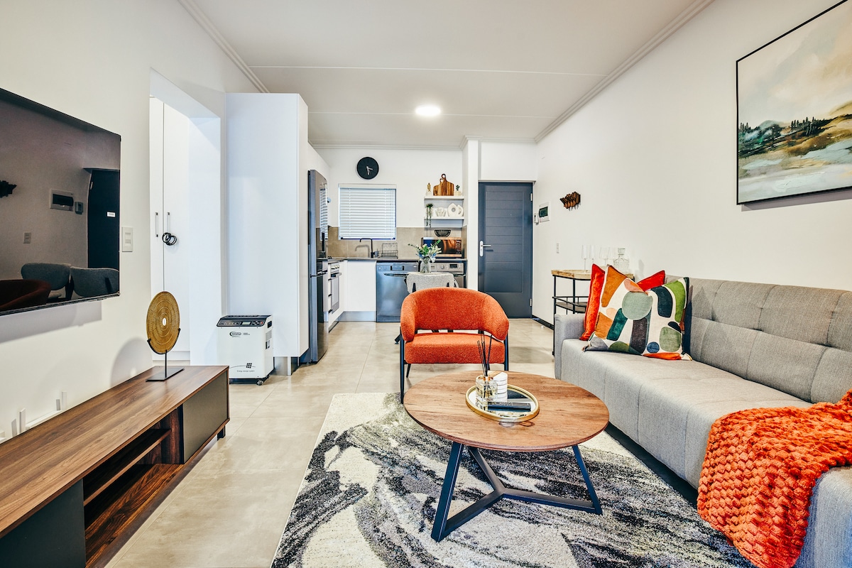 Welcome to your serene city escape!This beautifully designed 2 bedroom ground-floor apartment offers comfort, elegance & convenience.The master bedroom features a queen bed, and the guest bedroom has a double bed,both with plush linens & electric blankets.The modern bathroom boasts a spacious shower and a relaxing tub.Enjoy the fully equipped kitchen and stylish open-plan living, adorned with African-inspired art.Step outside to your private garden—a tranquil oasis for unwinding after exploring.