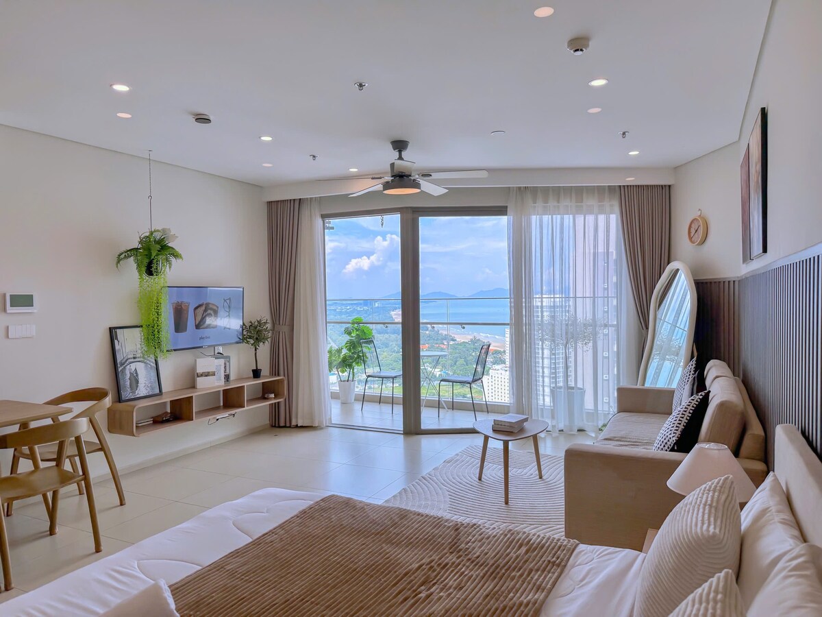 Minimalist, fully furnished 1BR apartment on the 15th floor with spectacular sea views. Ideal for couples or families with one child under 5. Perfectly located beside the Back beach (Thuỳ Vân beach). Estimated walking times to nearby amenities: - 2 minutes to reach the beach across the street - 5 minutes to the nearest 24/7 convenience store (GS25) - 8 minutes to the nearest supermarket (Lotte Mart) Fast elevators. Free Netflix. We also have one motorbike available for rent.