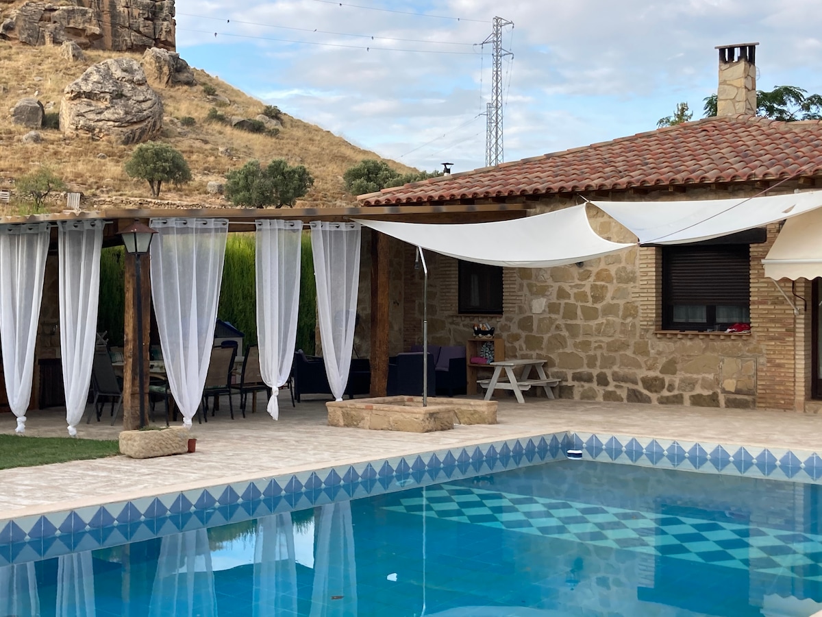 Disfruta de esta casa rural de + 200m2 en Belchite. Amplia, luminosa y con jardín y piscina privada en el centro de Belchite. Con vistas al pueblo viejo. Dos plantas: cocina equipada, dos salones, tres dormitorios, dos baños, bodega y sala de juegos. Ideal para parejas, familias o amigos que buscan comodidad, tranquilidad y buena ubicación. Check-in automático. Wifi. Calefacción y ventiladores de techo. Barbacoas. Aparcamiento puerta.