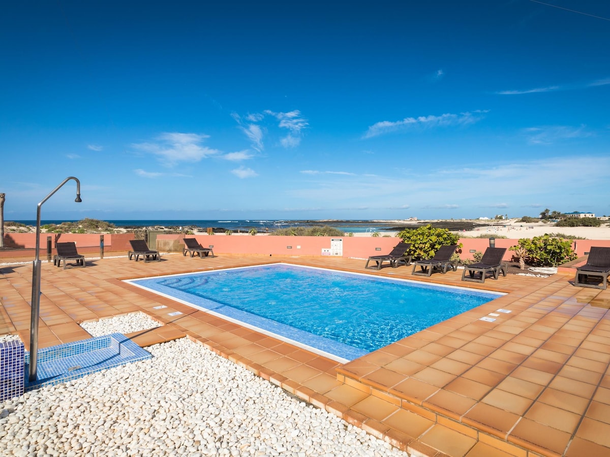 The apartment has an impregnable sea view and is located in the middle of a protected area near the beach of Sotavento, in the south of Fuerteventura. Nearby you will find a pristine beach with fine golden sand and crystal clear turquoise waters. It is an ideal place to practice various water sports . The apartment is fully equipped. There is an outdoor swimming pool with sun loungers (free of charge) and large terraces for sunbathing. We speak ENG / GE / SP / FR / DU / LU
