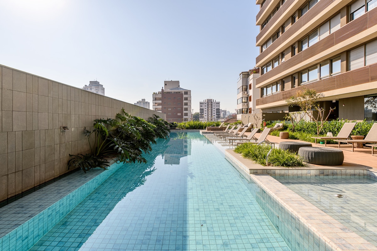 Στούντιο με θέα στο πάρκο και αυτοματισμούς/Alexa. Κλειστό γκαράζ, κουζίνα με βασικά είδη και κλινοσκεπάσματα/πετσέτες μπάνιου. Βρίσκεται σε κεντρική περιοχή, ταράτσα με πισίνα, γυμναστήριο και συνεργατικό χώρο. Το Parque da Redenção λίγα μέτρα μακριά, η Organic Fair και το Brique τα Σαββατοκύριακα, η γαστρονομία Refúgio do Lago και οι παραστάσεις στο Araújo Vianna Auditorium. Κοντά στα μπαρ, τα εστιατόρια και τη νυχτερινή ζωή των γειτονιών Cidade Baixa/Bom Fim. Εύκολη πρόσβαση στο Orla do Guaíba, πανεπιστήμια, νοσοκομεία και άλλες γειτονιές.