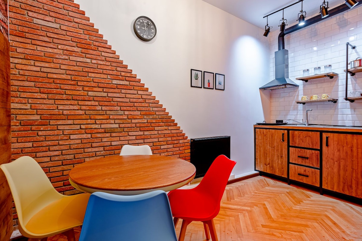 Απολαύστε μια εμπειρία γεμάτη στιλ σε αυτόν τον χώρο που βρίσκεται κεντρικά. Πρόκειται για ένα άνετο ανακαινισμένο διαμέρισμα με τούβλινη επένδυση που χαρίζει μια πραγματικά αίσθηση Τιφλίδας. Αυτό το στούντιο διαθέτει ένα διαφανές μπάνιο με μοντέρνα μπανιέρα, υπέρδιπλο κρεβάτι, καναπέ, τηλεόραση 55" με smart TV κ.λπ. Ο χώρος (60 τ.μ.) χωράει 2 άτομα και βρίσκεται στην παλιά περιοχή της Τιφλίδας, κοντά στην πλατεία της Ελευθερίας. Παρέχεται δωρεάν WiFi υψηλής ταχύτητας. Το διαμέρισμα βρίσκεται επίσης σε καλή τοποθεσία για μετακίνηση. Ο σταθμός του μετρό Freedom Square είναι σε κοντινή απόσταση.