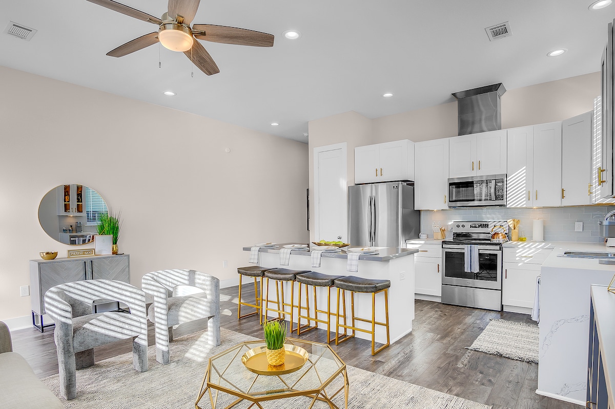 Conveniently located in EADO, this new home is minutes from the heart of downtown, William P. Hobby Airport, and many of Houston’s popular spots. This modern 3 story home offers 3 bedrooms (each with an en-suite bathroom and walk in closet), a half bath, gourmet kitchen, balcony, and luxurious finishes throughout. It is nestled within a quaint gated community and is perfect for a family vacation, group of friends, or couples trip.