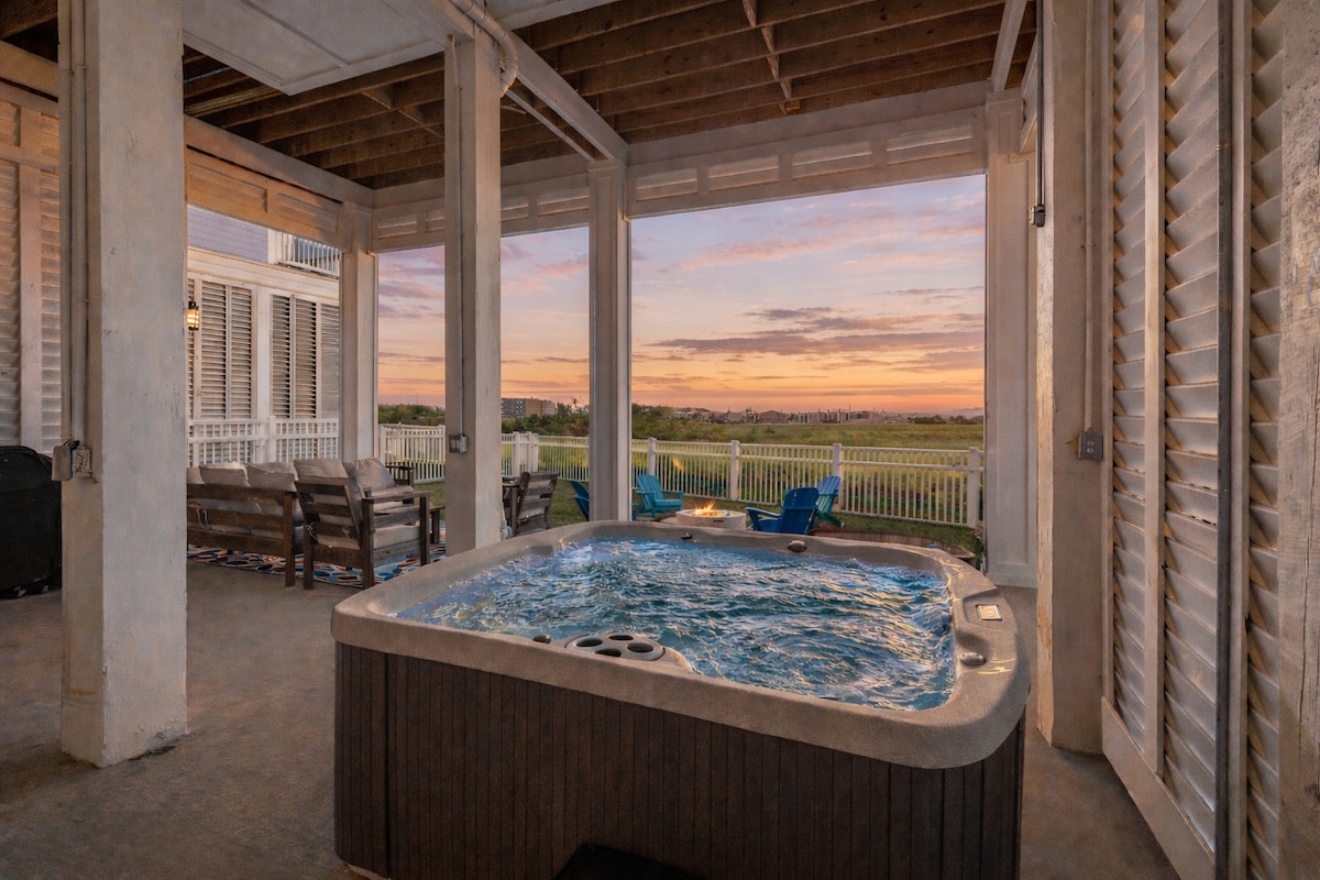 Ανεμπόδιστη θέα στον ωκεανό! Δείτε όλη την παραλία μέχρι το Γκάλβεστον. Τέσσερα υπνοδωμάτια και 3 1/2 μπάνια. Άφθονος χώρος και αρκετές βεράντες για να απολαύσετε τον ήλιο. Έχετε χώρο για να διασκεδάσετε, μέσα στο σπίτι της παραλίας, αλλά και από κάτω, όπου θα βρείτε ένα μεγάλο μπαρ, μπάρμπεκιου με προπάνιο/κάρβουνο, κούνιες, σοφίτα με αιώρα και εξωτερικό ντους. Περιφραγμένη αυλή. Ιδιωτική πρόσβαση στην παραλία. Γκουρμέ κουζίνα με ντουλάπι τροφίμων. Τηλεόραση σε κάθε δωμάτιο. Το master έχει μπανιέρα με θέα στην παραλία! Χωράει 14 άτομα