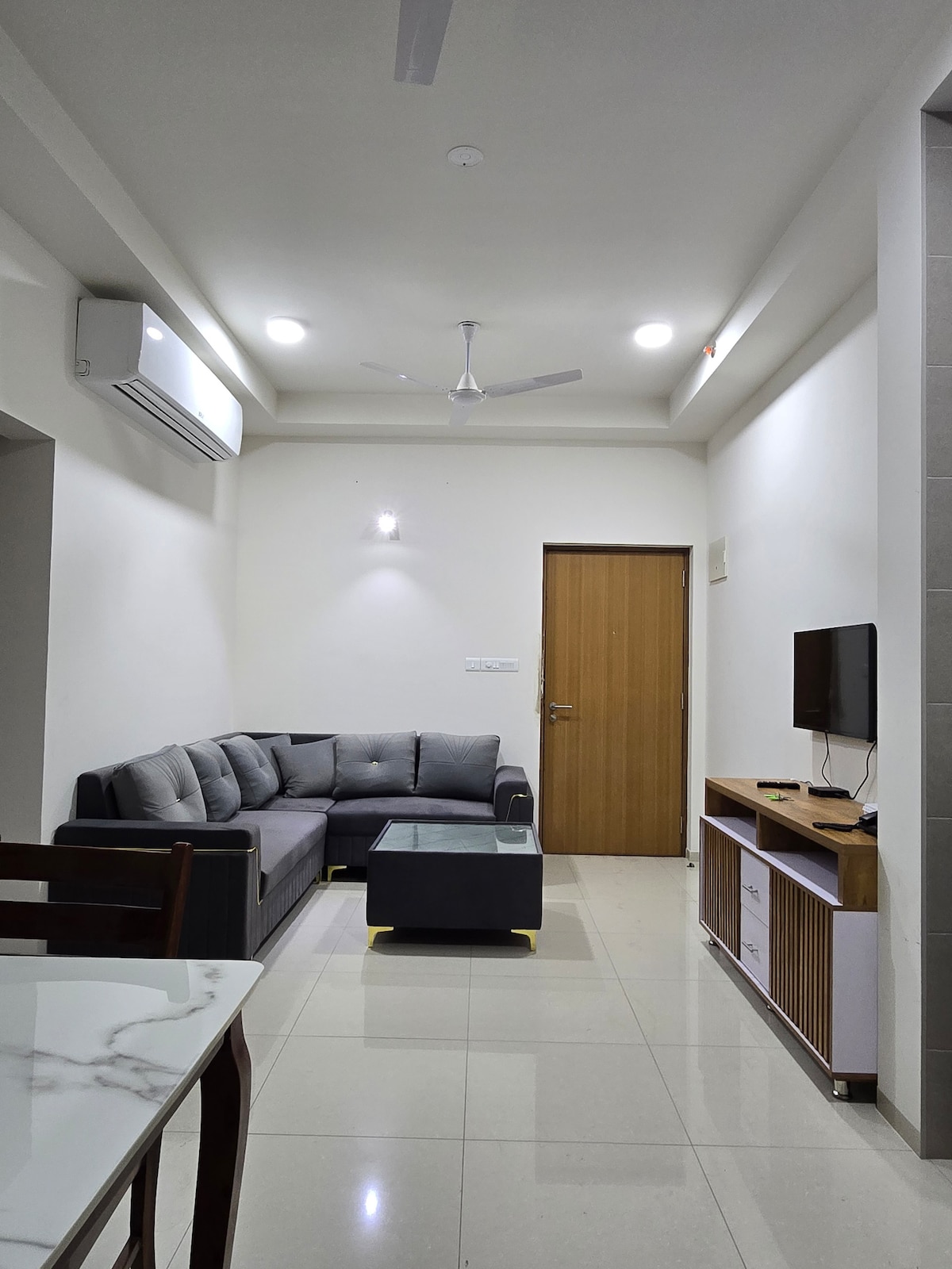 Brand new service apartment in Godrej Garden City, Ahmedabad. The apartment has 2 rooms, with 1 queen size bed for 2 persons and a sofa that can be converted to a 6×6 king size bed. Facilities like television, study/ work table, washing machine, kitchen including refrigerator, induction cook top, small utensils, steel cutlery, attached bath room with water heater, iron box, first aid kit and shoe stand are available. AC is available in one bed room and air cooler available in the hall.