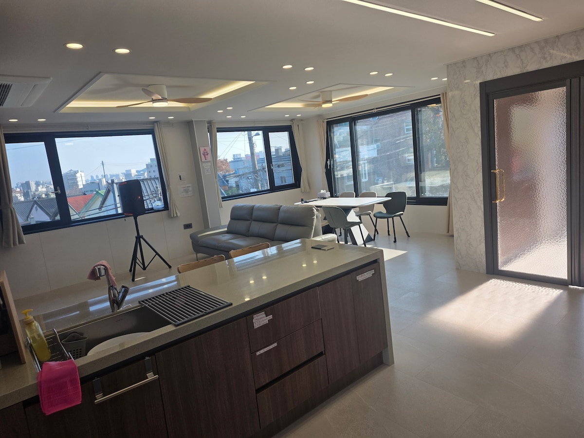 강릉 최고의 럭셔리 65평형 독채펜션 "펜션론다" 로 검색 한눈에 펼쳐진 강릉 최고의 바다뷰 ### 숙박료이외에 금액은 에어비앤비 수수료입니다 ### 저희 펜션은 2, 3층 복층구조이며 4계절 내내 바다를 보며 옥상에서 실내 바베큐가 가능합니다. 2층은 방 1개, 넓은 거실, 주방, 욕실 1개 방에는 킹사이즈 침대 한개가 준비되어 있으며 복층으로 3층은 방 2개(침대방 1개, 온돌방 1개)와 욕실 하나 차 한잔할수 있는 티테이블이 준비되어 있습니다. 방이나 거실, 옥상 어디에서도 일출은 물론 바다뷰가 가능 합니다. 집 전체 65평정도를 독채로 쓰시며 2~3가족이나, 회사동료들 끼리 오셔서 즐기시기에 적합합니다. 추가 인원은 3명(1인당 2만원) 더해서 최대 7명까지 가능 합니다. 옥상에서 실내 바베큐가능 ( 전기그릴) 유료(2만원), 기름난로제공 눈이나 비가 와도 바베큐 가능 합니다 많은 애용 부탁드립니다 . 감사합니다 ^^