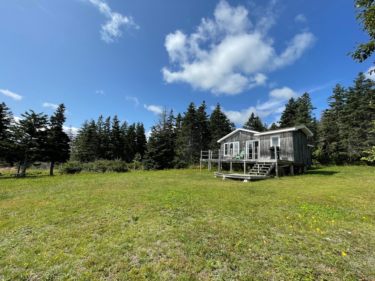 Alone on a forested cliff above a pristine barrier beach and a stunning ocean view, this cozy cottage is just off the Cabot Trail in Northern Cape Breton. The cottage offers stunning ocean and beach views; while tucked into the woods, hidden from view itself. Clean wood interior and gorgeous art complete it. A private retreat close to Park hiking trails. Free kayak rentals for week long rentals. Enjoy privacy and solitude where the mountains meet the sea.