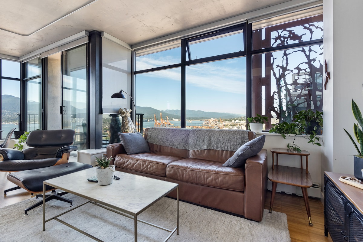 Αυτό το φωτεινό και ανοιχτό διαμέρισμα 102 τ.μ. βρίσκεται στο εμβληματικό κτίριο Woodward του Βανκούβερ και έχει πανοραμική θέα στα βουνά και στο λιμάνι του Βανκούβερ. Απολαύστε τον πρωινό καφέ σας στο μπαλκόνι καθώς ο ήλιος ανατέλλει και τα κρουαζιερόπλοια φτάνουν στο λιμάνι. Βγείτε έξω για να εξερευνήσετε τα καλύτερα εστιατόρια, αίθρια, καταστήματα, θέατρα και αθλητικές εκδηλώσεις του Gastown, όλα σε μικρή απόσταση με τα πόδια από το διαμέρισμα. Ο δεύτερος χώρος ύπνου περιλαμβάνει ένα άνετο κρεβάτι queen Murphy που ταιριάζει απόλυτα στην ανοιχτή διάταξη!