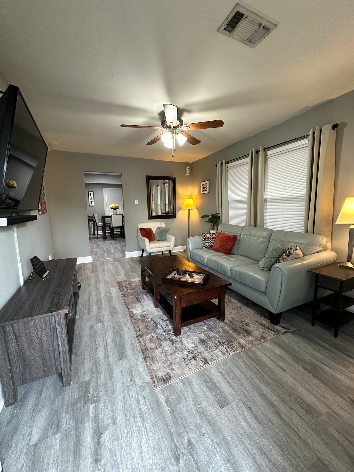 Enjoy our 3 bedroom 2 bathroom home in a quiet neighborhood that is minutes away from everything. Wake up feeling refreshed in our thoughtfully decorated home with 2 Queen sized beds and 2 single beds. One 50 inch smart TV in the living room and a 45 inch smart TV in the master bedroom. Internet and WiFi available for use. The Master has an en suite bath. Washer and dryer available. All major kitchen appliances available. Conveniently located. 19-STR-21456