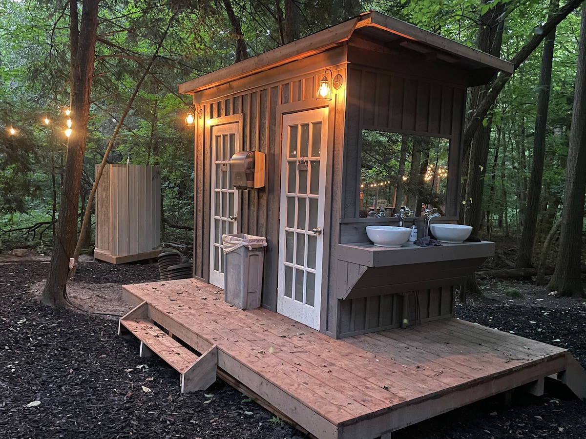 Beautiful glamping escape in the country! Welcome to your own private retreat nestled against the Niagra Escarpment. Your campsite is located on a 100 acre wooded property and is a nature lover’s paradise. Walking trails are located throughout the property and the Bruce hiking trail is nearby. Our property is conveniently located to access all of the activities and sites that this area has to offer-Georgian bay, numerous waterfalls, the Grotto and Collingwood. NEW-OUTDOOR HOT WATER SHOWER