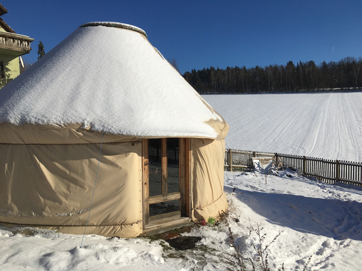 Τόσο το καλοκαίρι όσο και τον χειμώνα, η γιούρτα στο μεγάλο οικόπεδο που κατοικούμε σας προσκαλεί να μείνετε. Είναι καλά μονωμένη και θερμαινόμενη. Έχετε πρόσβαση σε κοινόχρηστο μπάνιο με τουαλέτα, μπανιέρα και ντους, φέρτε τον δικό σας υπνόσακο και φροντίστε τον εαυτό σας σύμφωνα με τα πρότυπα του κάμπινγκ. Παρέχουμε ηλεκτρική εστία, βραστήρα, κανάτα νερού και πιάτα. Στον κήπο υπάρχει εξωτερική μπανιέρα και ντους. Κατόπιν συνεννόησης με επιπλέον χρέωση: χρήση σάουνας / πρωινό.