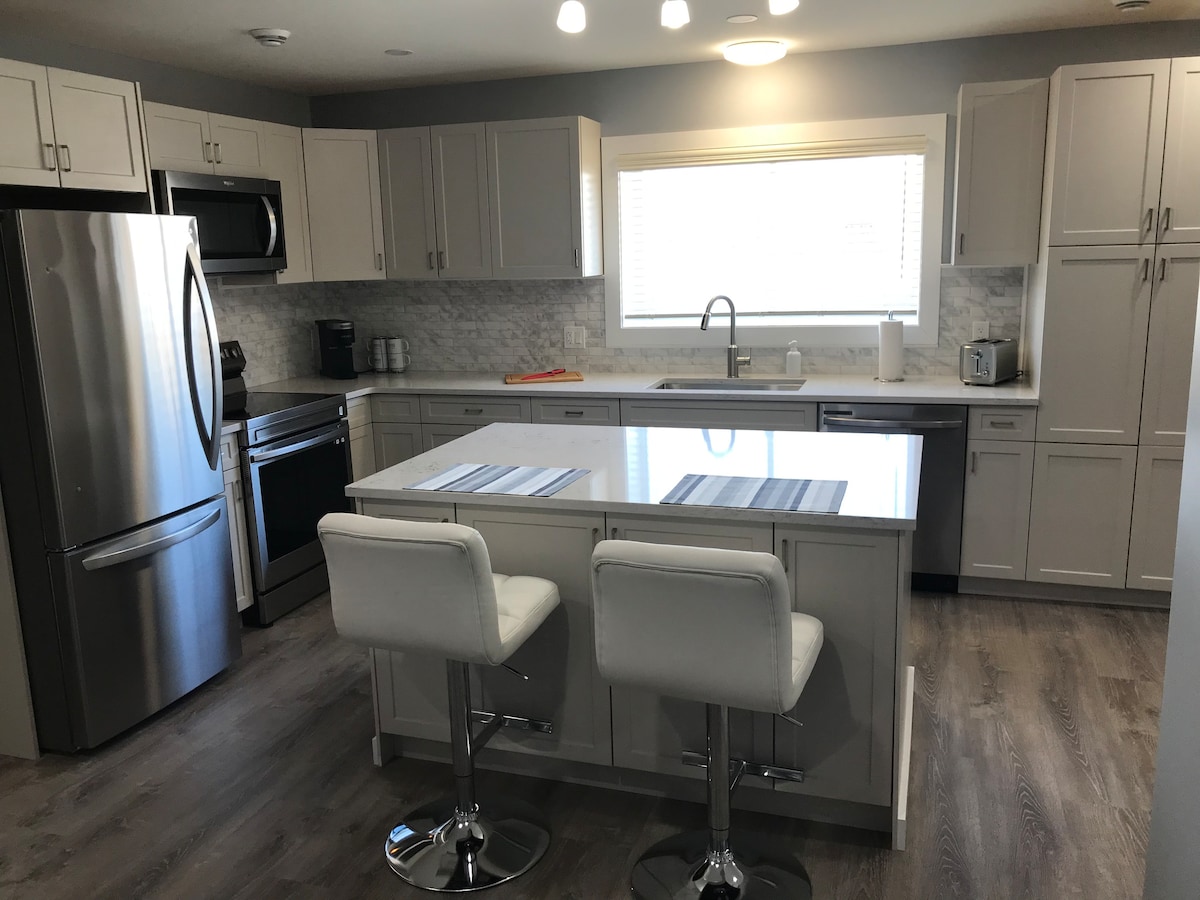 Welcome to our beautiful, fully renovated two bedroom unit, longer stays are welcome. Close to grocery stores, the airport, and the Sportsplex (swimming and arena) in a central location. The space boasts a bright open concept living room and fully functioning kitchen.