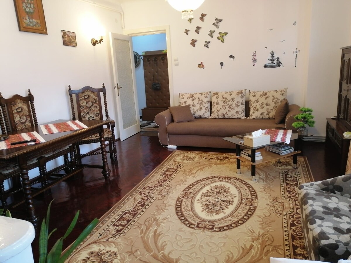 Σε ιδανική τοποθεσία, 75 τ.μ. διαμέρισμα, κοντά στη λεωφόρο Victoriei και την πλατεία της Επανάστασης, επίσης απέναντι από το όμορφο πάρκο Cismigiu. Οι επισκέπτες απολαμβάνουν 2 ξεχωριστά υπνοδωμάτια και ένα διπλό σαλόνι που μπορούν να μεταμορφωθούν, όταν χρειάζεται, σε ένα 3ο υπνοδωμάτιο που προσφέρει πλήρη ιδιωτικότητα από το σαλόνι, κλείνοντας τις παχιές γυάλινες πόρτες που έχουν αδιαφανείς κουρτίνες. Διατίθενται 2 πλήρη μπάνια και πλήρως εξοπλισμένη μικρή κουζίνα. Μπορούμε να παρέχουμε μεταφορά από/προς το αεροδρόμιο.