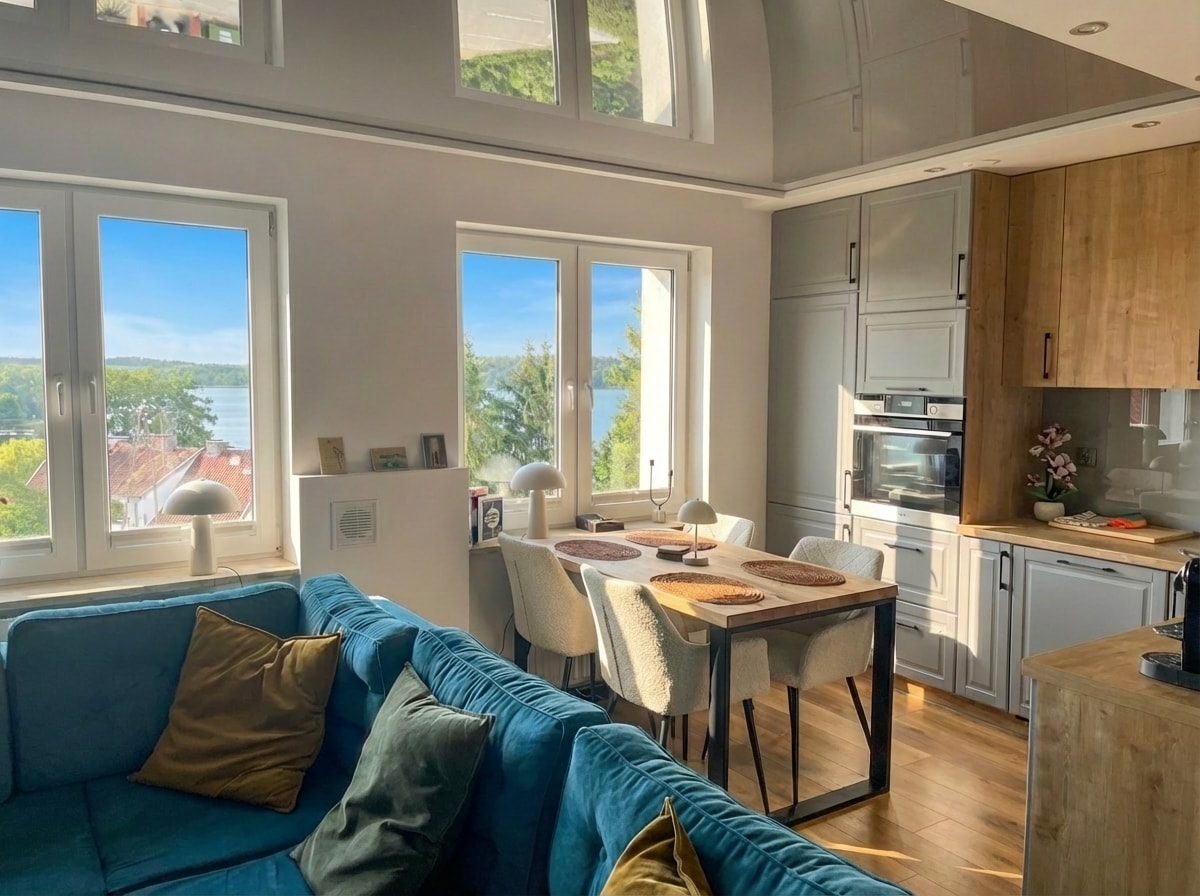 Welcome to our stylish holiday apartment in Mrągowo, just meters from the lake. Enjoy a beautiful lake view from the living room, two cozy bedrooms, a spacious lounge with kitchenette, air conditioning, and TVs in every room. Quiet yet central location—restaurants, shops, and the lake are nearby. Free parking is available. Perfect for a relaxing stay or adventures in the Masurian Lake District!