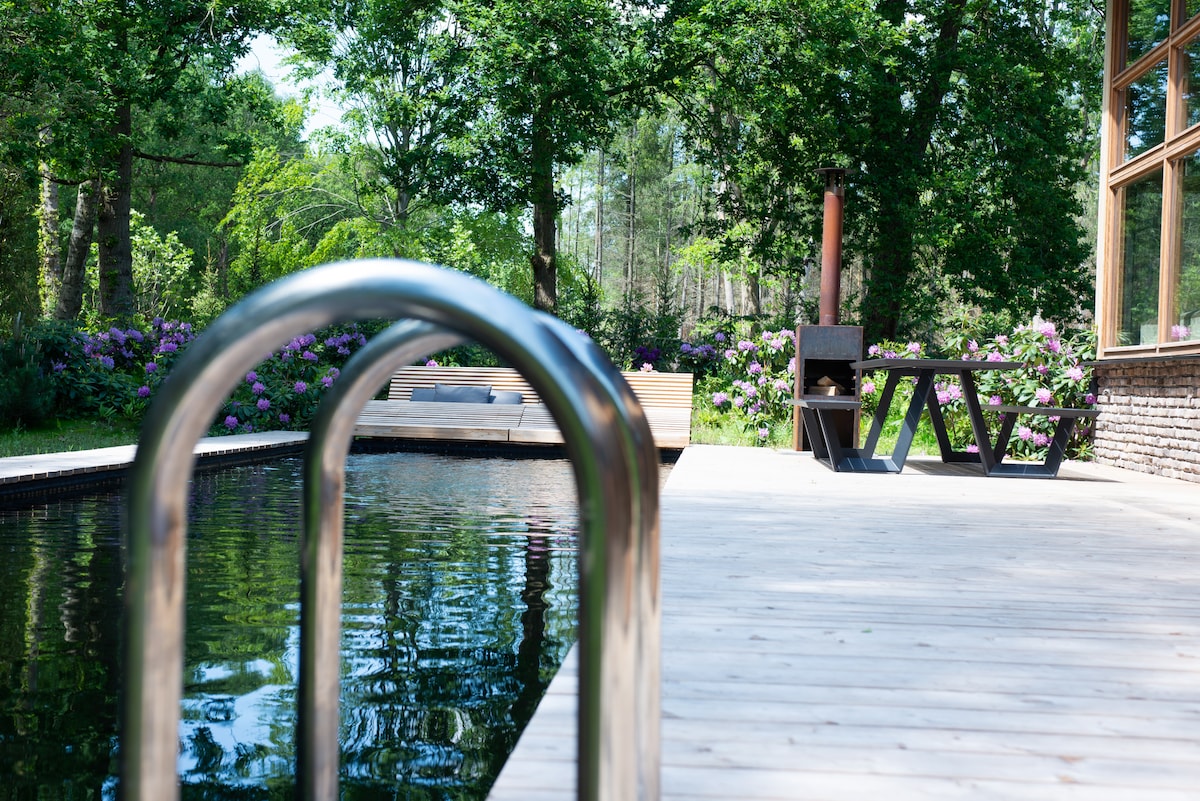 Luxe wellness aan de rand van het bos op de Veluwe. Uniek gastenverblijf voor twee personen met exclusief privégebruik van het overdekte zwembad, douches, eigen badkamer en (finse) sauna. Eigen inrit en volledig ingerichte keuken in parkachtige tuin. Geen dieren toegestaan! Het gebouw bestaat voor een groot deel uit (deels gespiegeld) glas en heeft geen gordijnen. Op fietsafstand van de Hoge Veluwe, station Apeldoorn en Paleis het Loo. Ideale locatie voor mountainbike, running en fietstochten.