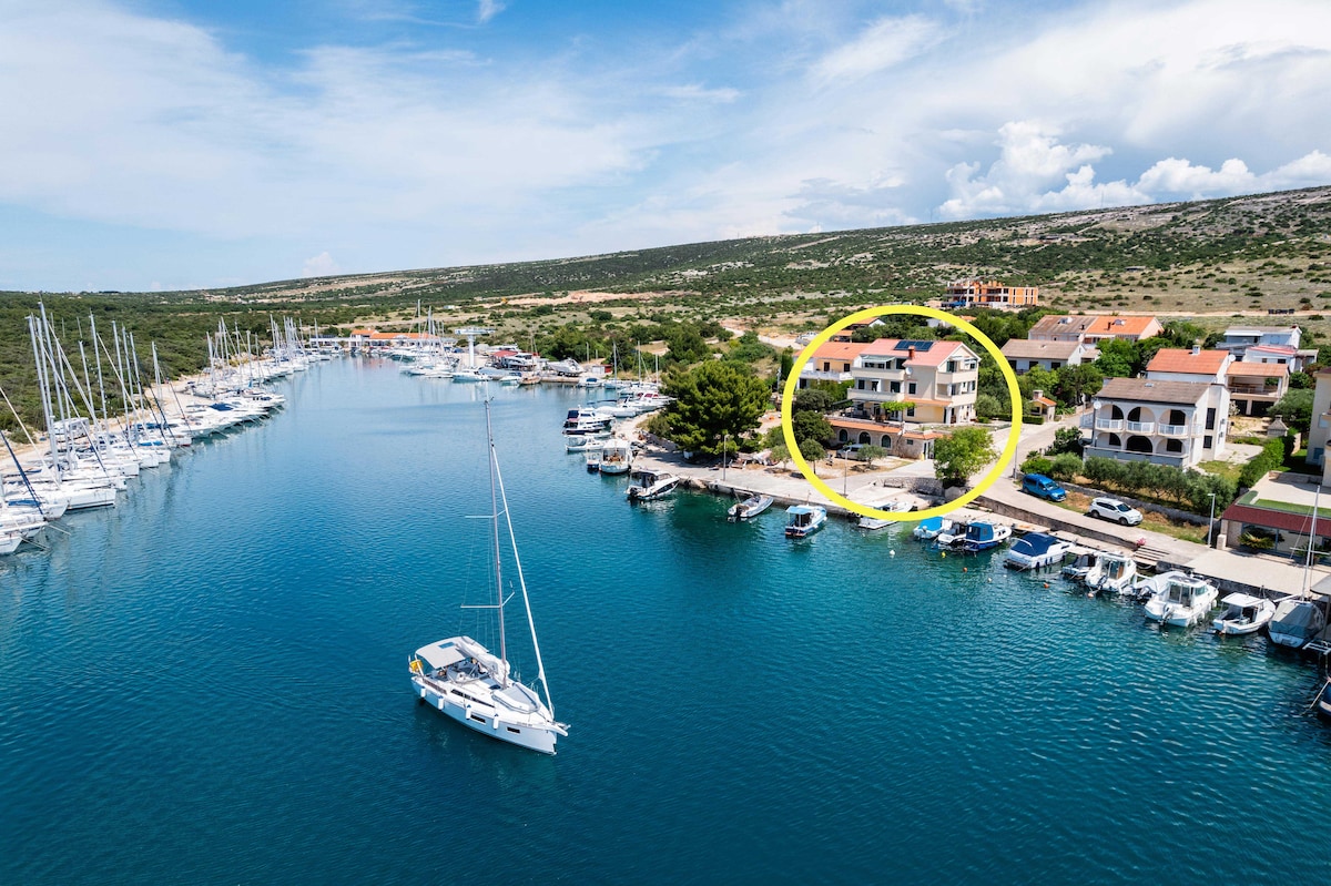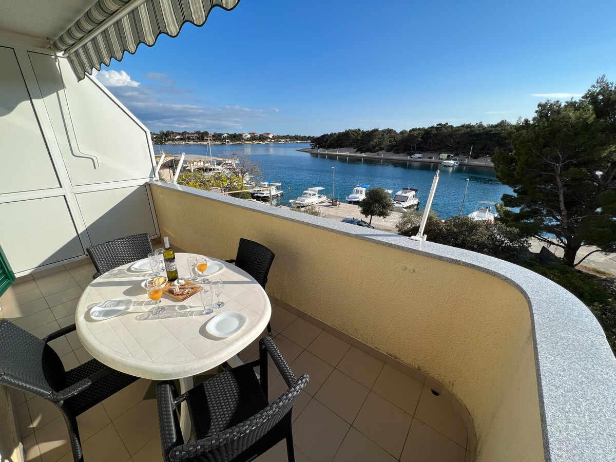 The apartment is located on the 2nd floor of the house with 4 apartments total. This comfortable apartment can accommodate up to 6 people in two bedrooms. Equipped with sofa, smart TV, bathroom, kitchen and balcony with sea view. In front of the apartment there is a private parking space and a waterfront promenade with its own beach, shower and private boat mooring. All the guests can use gym, kayak, SUP and bikes for recreation. Šimuni is a traditional fishing village with fresh fish everyday.