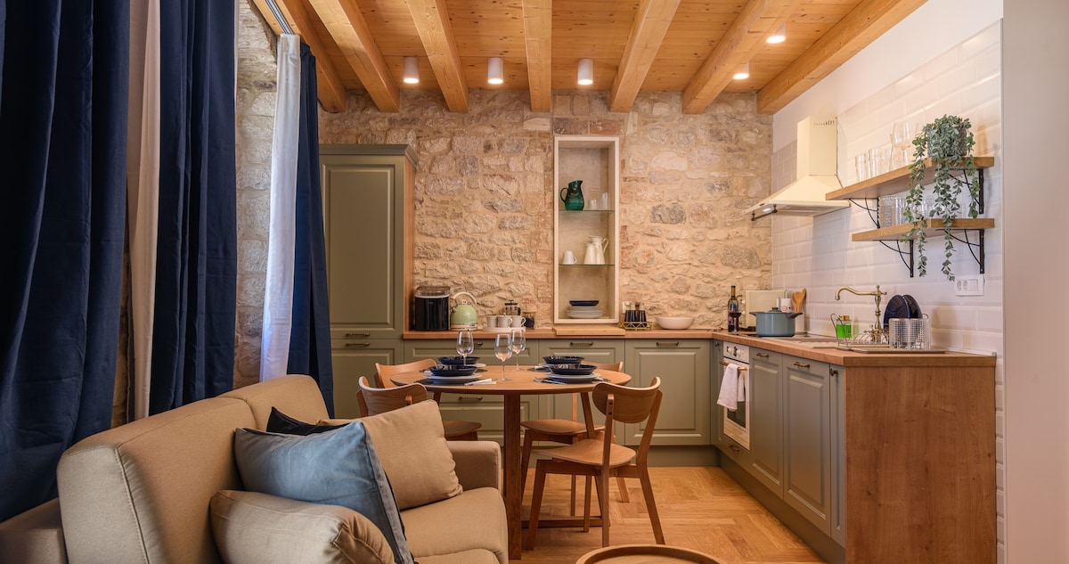Ανάμεσα στα όμορφα αναγεννησιακά και μπαρόκ παλάτια στην καρδιά του Τρόγκιρ, βρίσκεται το διαμέρισμά μας. Είναι εμποτισμένο με μοντέρνες πινελιές, ενώ παραμένει πιστό στην κληρονομιά του και σε χαρακτηριστικά αιώνων. Βρίσκεται στον δεύτερο όροφο του παλιού αρχοντικού. Η κύρια πύλη και η αυλή είναι η είσοδος στο παλιό συγκρότημα του αρχοντικού, με την παλιά πέτρινη σκάλα να οδηγεί στον πρώτο όροφο και την είσοδο του ρετιρέ. Μια άλλη σειρά από απότομες στενές σκάλες οδηγεί στον δεύτερο όροφο και τη σοφίτα.