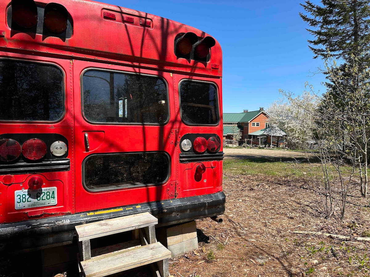 The Red Bus is a refurbished Bluebird short bus offering cozy shelter for double occupancy. This is an awesome space for a small family or couple looking to enjoy the pleasures of simple living close to the White Mountains. The Red Bus is about 300m from the main house, and 50m from parking. Electricity is provided. KNOWLEDGE OF WOOD-STOVE USE REQUIRED. There is a small wood-stove and logs for use in cold weather. PLEASE PROVIDE YOUR OWN PILLOWS AND BEDDING OR REQUEST LINENS FOR A $15 FEE.