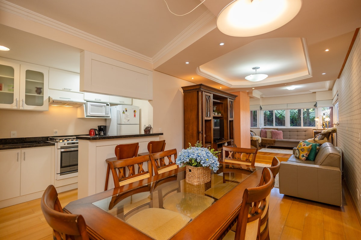 Viva momentos únicos na Serra Gaúcha! Hospede-se em um flat completo com a estrutura de um hotel e o conforto de casa. Lareira, piscina aquecida, sauna, brinquedoteca, academia e muito mais. Nosso flat está em local tranquilo, apenas 700 metros da Catedral de Pedra (cartão postal/centro de Canela). Fica em uma rua residencial arborizada, com fácil acesso a cafés, restaurantes e lojas. Ao lado área verde, contato com a natureza. Serviço de café da manhã (custo à parte) entregue no apto.