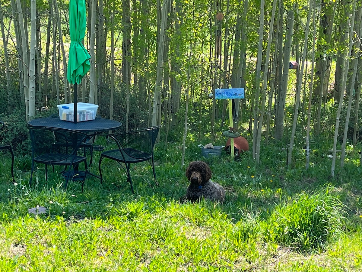 Whether it be play time or quiet time (or both!), we offer our guests (and pets) the comfort of a large studio and yard at the end of a dead end street. You have a beautiful mountain setting with easy access to all your favorite summer activities. In addition, we are 45 minutes from Rocky Mountain National Park and the lakes of Grand Lake. After enjoying a perfect Colorado day, come back to your spacious room for a drink on your private patio to think about what restaurant to enjoy.