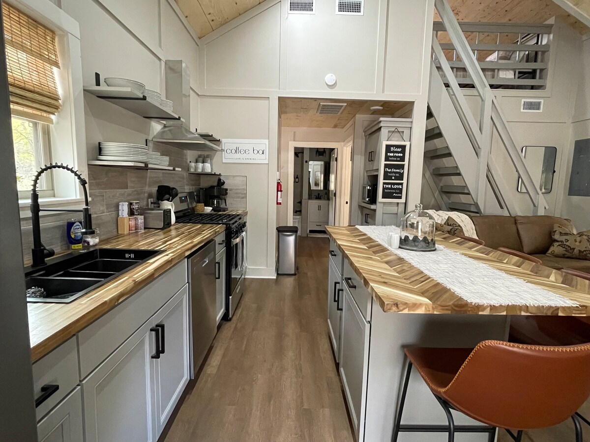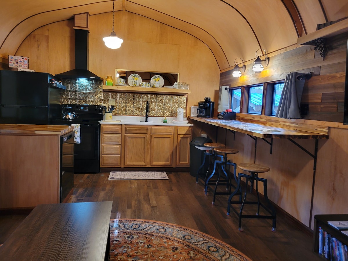 Railroad themed! Affordable and Unforgettable. Enjoy your stay and don't forget to snap a picture in front of our 'town facade fence' This home has a full kitchen, laundry center, dining bar, microwave, coffe maker(regular & pods), dishwasher, bathroom with shower, private bedroom with queen, smart TV, wifi, games, movies, and fold out sofa bed. There's parking for two vehicles but not enough for a trailer unless your great at backing out. We do have a place you can park a trailer nearby.