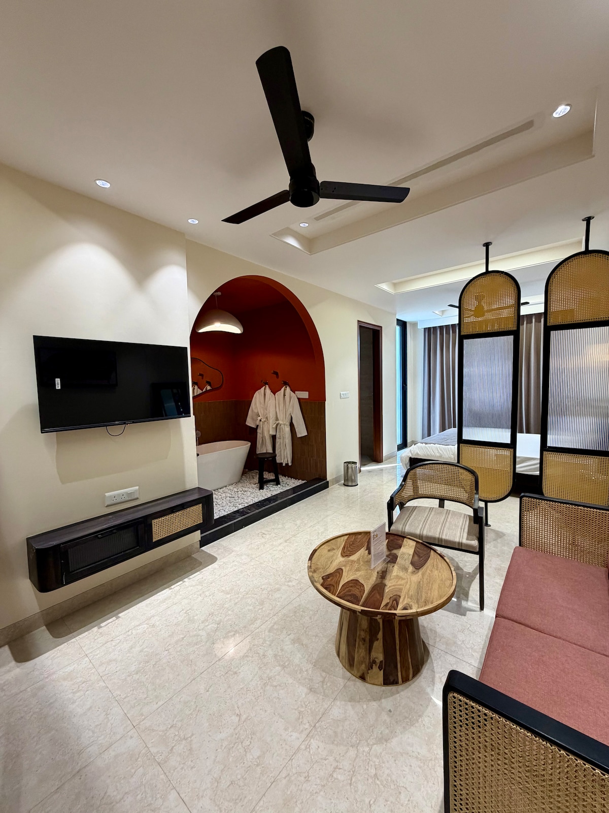 Ανακαλύψτε μια πολυτελή σουίτα στην ταράτσα στην καρδιά του Gurgaon, μόλις λίγα λεπτά από τον σταθμό του μετρό HUDA City Centre. Αυτό το κομψό δωμάτιο με βεράντα προσφέρει έναν συνδυασμό άνεσης, ιδιωτικότητας και μοντέρνου σχεδιασμού — ιδανικό για ζευγάρια ή ταξιδιώτες για επαγγελματικούς σκοπούς. Βγείτε στην ιδιωτική σας βεράντα με καθίσματα εξωτερικού χώρου, το ιδανικό μέρος για πρωινό καφέ ή βραδινή χαλάρωση. Χαλαρώστε στο τζακούζι κάτω από τον ανοιχτό ουρανό, προσφέροντας μια ήρεμη και ρομαντική εμπειρία. Βρίσκεται στον 5ο όροφο (πρόσβαση με ασανσέρ μέχρι τον 4ο