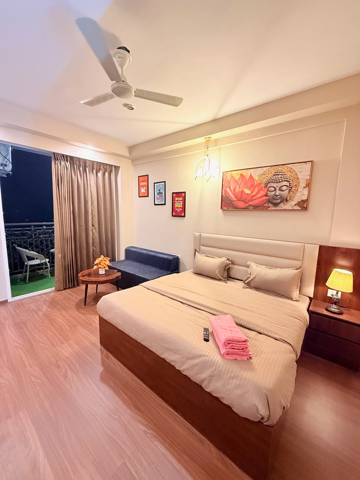 Good Monthly stay discounts available. Kick back and relax in our elegant & fully furnished studio. The earthy interiors will calm you like a boutique hotel experience. A combined charm of English design elements and luxury that offers comfort and style in every corner. We've designed this space with the same care and attention to detail as we were to live here ourselves, prioritizing comfort, style, and authenticity. Top floor | Fast WIFI | Private Balcony | Heart of Noida