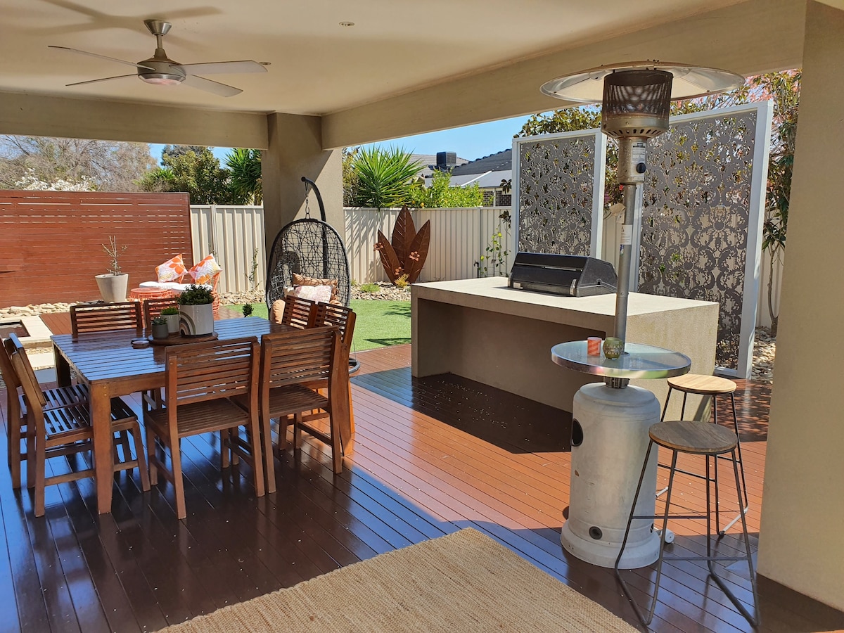 When in Shepparton make your stay enjoyable by relaxing in our newly renovated home featuring Modern Kitchen with a open window feature looking out to the bar and seperate indoor dining area and peaking through to the lush backyard. Relaxing Family Retreats, Private Courtyard with Breakfast Bar to the front of the house, which overlooks the Parklands and Playground. Featuring an outdoor Kitchen and B.B.Q area, Heated Jacuzzi and Spacious Decking. This gorgeous outdoor area is set with