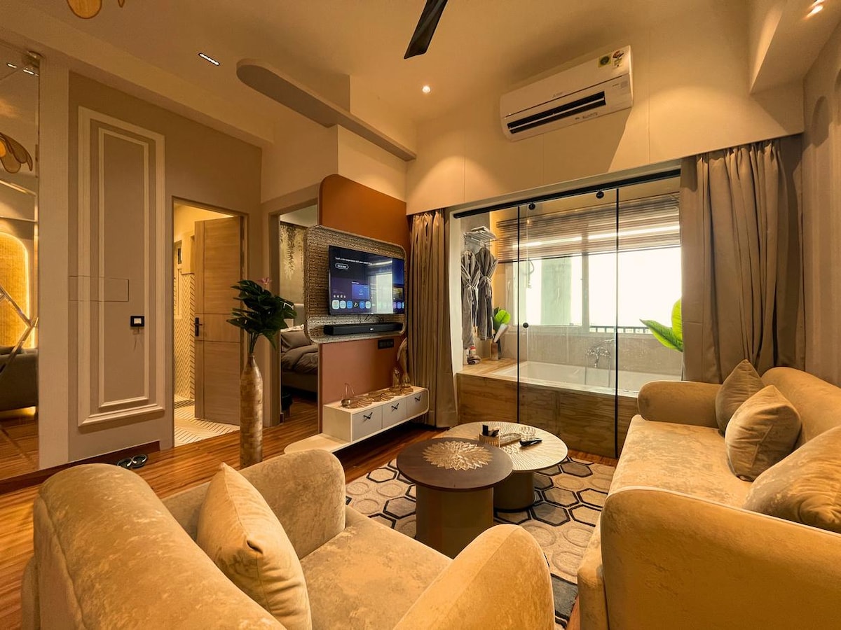 Ένα γήπεδο γκολφ, λίμνη, ανατολή και πισίνα με θέα ολόκληρο πολυτελές διαμέρισμα - Πλήρως επιπλωμένο με τζακούζι, κλιματιστικά, θερμαντήρα, καθαριστή αέρα, πλυντήριο, ψυγείο, LED, WiFi, προϊόντα περιποίησης, ασανσέρ, πλήρως λειτουργικό φούρνο κουζίνας, φούρνο αερίου, RO, σκεύη κ.λπ., επιπλέον κρεβάτι - Ζήστε μια μαγευτική διαμονή στη φύση στα καλύτερά της! Αυτό είναι ένα όμορφο διαμέρισμα 2 υπνοδωματίων για διαμονή σε σπίτι, αλλά θα δοθεί μόνο 1 υπνοδωμάτιο (ολόκληρο το κατάλυμα). Το 2ο μικρότερο δωμάτιο είναι κλειδωμένο. Πρωινό - NA. Κατάλληλο για ζευγάρια, ιδανικό για συναντήσεις και πάρτι! Στην υγειά μας!