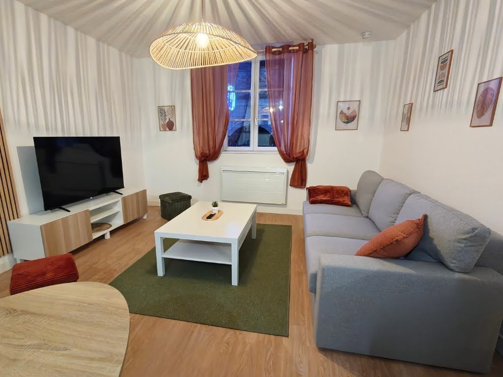Στην καρδιά της πόλης, 2 βήματα από τη μεσαιωνική μας αίθουσα, μοναδική στη Γαλλία για την ποιότητα της αρχιτεκτονικής της Αρχοντικό στο οποίο το σαλόνι βρίσκεται στον επάνω όροφο. Φωτεινά δωμάτια. Θα έχετε μια εξοπλισμένη κουζίνα (φούρνος, πλυντήριο πιάτων, φούρνος μικροκυμάτων, ψυγείο με καταψύκτη). Μια όμορφη γονική σουίτα με ένα μονό κρεβάτι σε εσοχή που μπορεί να χρησιμοποιηθεί ως πάγκος για ανάγνωση ή ως χώρος ύπνου για παιδιά. Ένα δεύτερο υπνοδωμάτιο με ένα διπλό κρεβάτι. Ένα μπάνιο με ντουζιέρα.