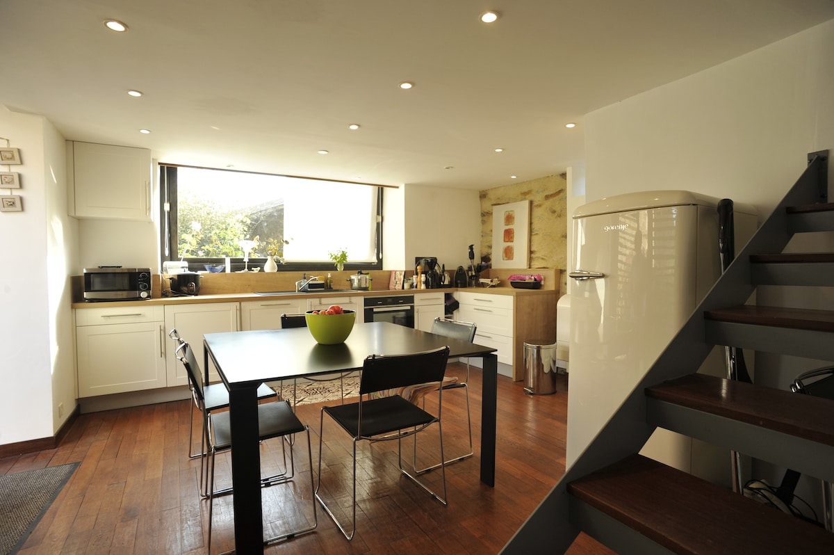 Ελάτε να ανακαλύψετε αυτό το κατάλυμα με την προσεγμένη διακόσμηση και απολαύστε μια στιγμή χαλάρωσης στο ιδιωτικό του μπάνιο. Ξενώνας που βρίσκεται 10 λεπτά από το Λαβάλ, κοντά στους μεγάλους άξονες (αυτοκινητόδρομος 5 λεπτά), στις όχθες του ποταμού Mayenne και του μονοπατιού του. Περιλαμβάνει σαλόνι/τραπεζαρία/κουζίνα (εξοπλισμένη και επιπλωμένη), έναν χώρο ύπνου που ανοίγει στο ιδιωτικό τζακούζι, ένα μπάνιο και τουαλέτα. Απολαύστε έναν όμορφο κήπο και άμεση πρόσβαση στο μονοπάτι της ρυμούλκησης.