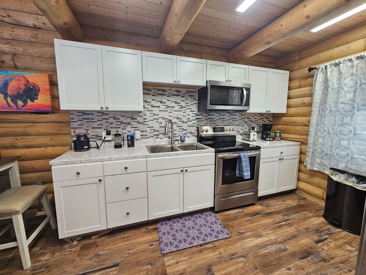 Το ξυλόσπιτό μας κοντά στο Γέλοουστοουν είναι πλήρως εξοπλισμένο με όλες τις παροχές που χρειάζεστε για μια άνετη διαμονή. Θα λατρέψετε τη ρουστίκ αλλά μοντέρνα αίσθηση που προέρχεται από ξύλινα ταβάνια και διακοσμητικά στοιχεία, χειροποίητα έπιπλα και πάγκους από γρανίτη. Η καμπίνα διαθέτει δύο διπλά κρεβάτια, ένα υπέρδιπλο κρεβάτι στην Καλιφόρνια και δύο πλήρη μπάνια. Αυτό το ξυλόσπιτο είναι κατάλληλο για παιδιά και εύκολα προσβάσιμο από τον αυτοκινητόδρομο 20. Υπάρχει άφθονος χώρος στάθμευσης και έχουμε επίσης πρόσβαση σε ράμπα για όσους δεν μπορούν να χρησιμοποιήσουν τις σκάλες.