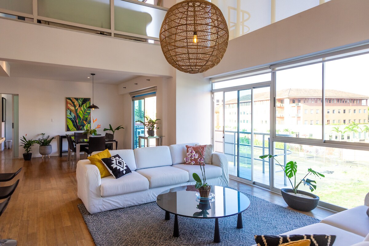 Enjoy contemporary elegance at Euroloft, a large (220 sq mt/ 2,368 sq ft) light-filled, duplex, modern loft penthouse in Guachipelín de Escazú. This exclusive space features floor-to-ceiling windows, 2 spacious bedrooms, walk-in closets, 3 full bathrooms (2 ensuite, including 1 jetted tub), mezzanine TV room w/ queen sofa bed. Fully furnished and equipped with 3 smart TVs, high end appliances, washer, dryer, dishwasher, A/C splits.We offer 2 vehicles parking and spacious balconies on both floors