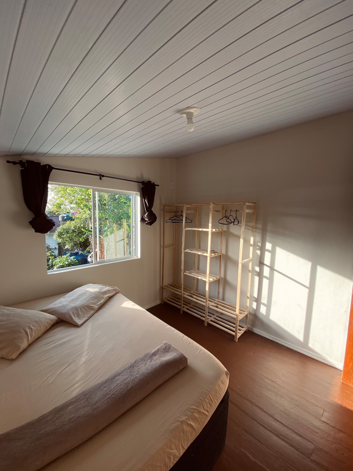 A uma quadra da praia, Mar de Flor fica num quintal compartilhado com plantas, gatos e cachorros. Temos uma cozinha completa ao ar livre, rede e sofá para descanso e ventilador pra manter o ambiente fresco. O quarto conta com uma linda vista para o jardim e está equipado com ar condicionado e armários para maior conforto dos hóspedes. O banheiro tem uma deliciosa ducha pra relaxar! Temos também um chuveiro externo refrescante! Venha conhecer e relaxar no nosso Mar de Flor. Não temos Wi-Fi