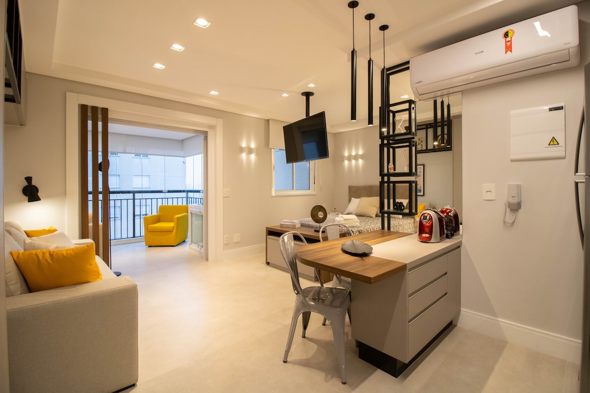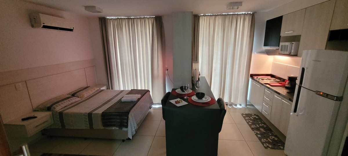 Πρόσφατα διοργανωμένο στούντιο, σχεδιασμένο για όσους εκτιμούν ένα λειτουργικό, κομψό και σε καλή τοποθεσία περιβάλλον. Η μονάδα μπορεί να φιλοξενήσει μέχρι 2 άτομα και προσφέρει πλήρως εξοπλισμένη κουζίνα με νέες συσκευές, σαλόνι με καναπέ και έξυπνη περιστρεφόμενη τηλεόραση (υπνοδωμάτιο/σαλόνι), διπλό κρεβάτι, μοντέρνο μπάνιο με υπέροχη ντουζιέρα και μπαλκόνι με τραπεζαρία. Ιδανικό για επαγγελματικά ταξίδια ή διαμονές αναψυχής, με χώρο για γραφείο στο σπίτι και δομή σχεδιασμένη για μια πρακτική, αποτελεσματική και φιλόξενη εμπειρία στο Guarulhos.