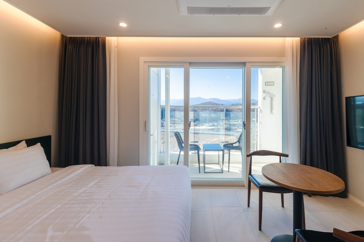 깔끔하고 아늑한 인테리어, 고층과는 다른 중층만의 시야가 꽉찬 환상적인 바다와 모래 해변, 파노라마 파도뷰로 온 마음을 힐링할 수 있는 매력적인 숙소입니다. 🏖🏝🌊 서핑들의 성지 양양 죽도해변, 인구해변과 이어져 있으며 데크길 따라 산책하다보면 양리단길 도착~!🛤 또한 발코니를 통해 동해의 장관, 일출을 숙소에서 감상하세요.🌅🌌 발코니에 등기대고 앉아 커피 한 잔의 여유도 좋답니다. 여기야말로 진정한 커피 맛집👍☕️☕️☕️ 양양 종합여객터미널에서 22분, 강릉 시외버스터미널에서 37분 거리에 위치하고 있습니다. 편안함과 안락함을 선사하는 객실로 더블베드로 구성되어 있습니다. ▶비대면 체크인(숙소의 키패드 번호 입력하여 입실 가능) ▶전문 세탁소에서 고온 살균된 침구 제공 ▶소독제, 살포를 통한 객실 소독, 방역 ▶취사 가능(냄비, 프라이팬 등의 조리도구와 식기제공) ▶넷플릭스(본인 계정으로 로그인하여 시청) ▶메세지 응답 시간 : 오전 09:00~오후 11:00