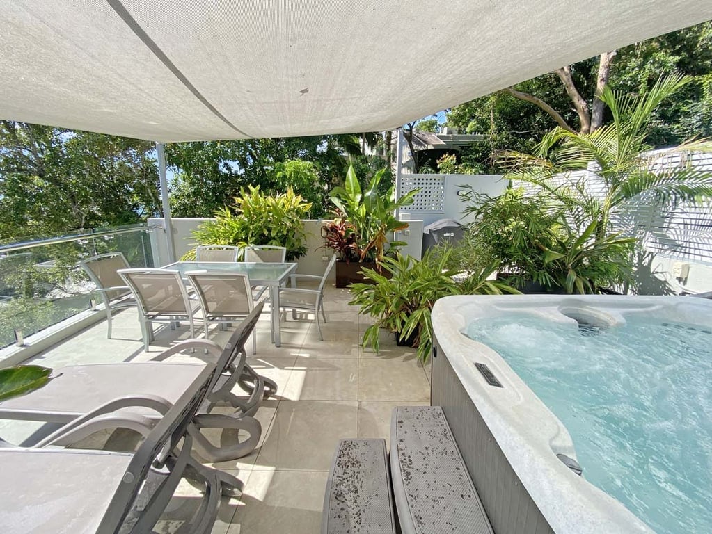 Με τη δική του ιδιωτική ταράτσα με θερμαινόμενο σπα, μπάρμπεκιου, υπαίθρια τραπεζαρία και ξαπλώστρες, αυτό το διαμέρισμα είναι ιδανικό για οικογενειακές διακοπές στην παραλία ή ρομαντική απόδραση. Χαρακτηριστικά - Θέα στην πισίνα - Κλιματιζόμενο σαλόνι και κύριο κρεβάτι – ανεμιστήρες οροφής σε όλους τους χώρους -Κύρια κρεβατοκάμαρα με κρεβάτι, τηλεόραση και ιδιωτικό μπάνιο -2ο υπνοδωμάτιο με 2 μονά κρεβάτια (μπορεί να γίνει βασιλιάς κατόπιν αιτήματος) - Δεύτερο μπάνιο με μπανιέρα και ντους πάνω από το μπάνιο- ενσωματωμένο πλυντήριο ρούχων με πλυντήριο και στεγνωτήριο - Άνετη κουζίνα/τραπεζαρία/σαλόνι με ενιαία διαρρύθμιση - Δωρεάν wifi