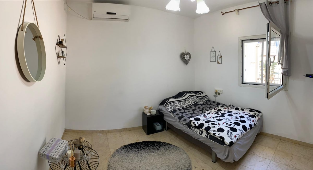 Forget your worries in this spacious and serene space. It is the upper floor of a private house with a private entrance. Very easy access from the street. Plenty of free parking. You will definitely enjoy the balcony off the living room overlooking the Galilee mountains and the northern sea shore. In the living room there is a large, 65”, TV with Netflix, Israeli channels and more. Self check in (at 3:00 pm) and checkout (at 11 am). Please let us know if you will need one or two bedrooms.