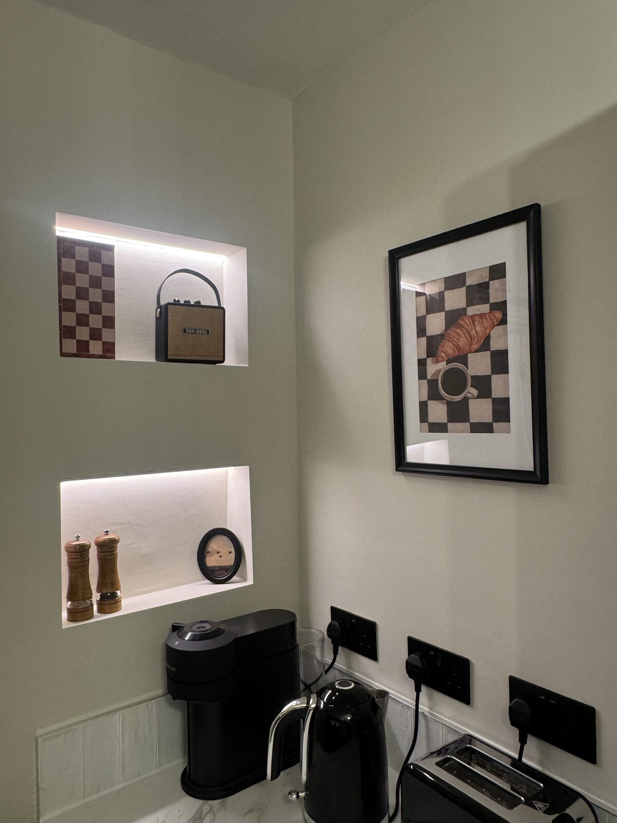 PRIVATE ENTRANCE With outside seating area. Adorable self contained suite. One double bedroom with single beds also providing two comfy chairs and Smart TV. Private en-suite bathroom and separate compact area (kitchenette), for preparing light breakfast with Toaster, microwave,kettle, fridge, freezer and air fryer. Tea and coffee, cereal bread butter provided. Free parking & Wi-Fi. CO-OP Supermarket five minutes walk. Cosy, dog friendly pub/restaurant alongside Coop.