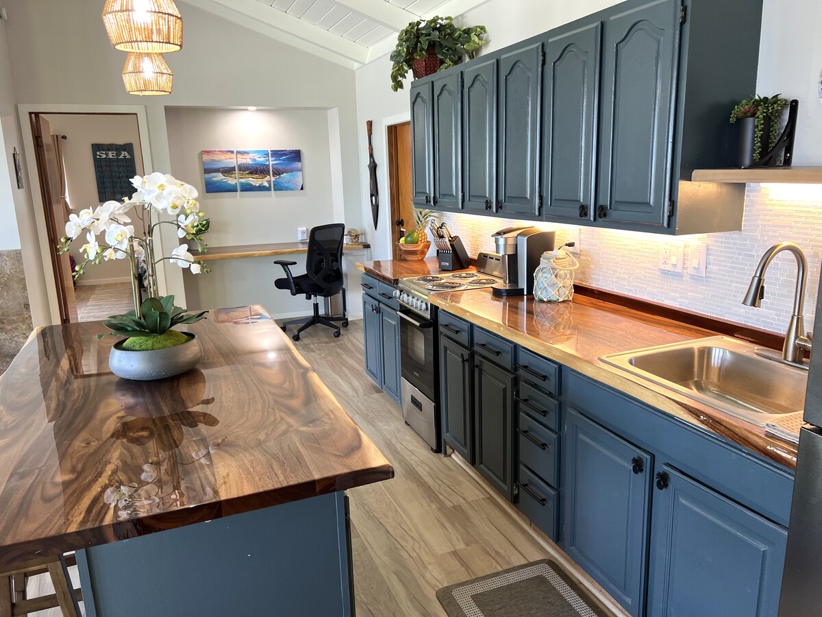 Ελάτε να απολαύσετε την απόδρασή μας στην παραλία Princeville με κλιματισμό, εκπληκτική θέα στη ζούγκλα, το βουνό και τον μακρινό καταρράκτη! Χαλαρώστε στο μπαλκόνι, πιείτε καφέ ή κρασί και απολαύστε το γαλήνιο περιβάλλον. Η πλήρως ανακαινισμένη κουζίνα κάνει το φαγητό παιχνιδάκι. Απέχει μόλις λίγα βήματα από τον περίφημο γκρεμό και την παραλία Hideaways, και μια γραφική βόλτα κατά μήκος του μονοπατιού του ωκεανού σας φέρνει στο 1 Hotel και στο εστιατόριο Hanalei Bay. Ο παράδεισος σας περιμένει!