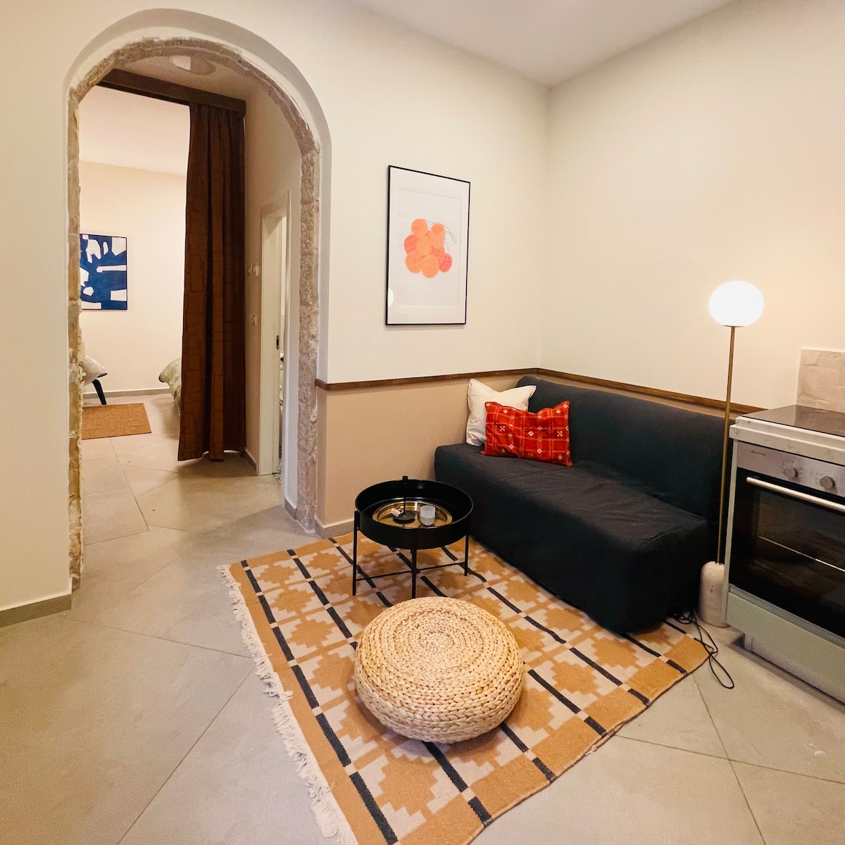 A sought-after studio in the heart of Jerusalem, on the 6th floor with an elevator, directly across from Mahane Yehuda Market. Cleverly divided into two spaces, it features a cozy living area, a fully equipped kitchen with a dining corner, and a comfy double bed. Thoughtfully designed, it balances style and function perfectly. Enjoy the lively atmosphere, easy access to public transportation, and all the city's top attractions just steps from your door. Perfect for a memorable stay in Jerusalem!