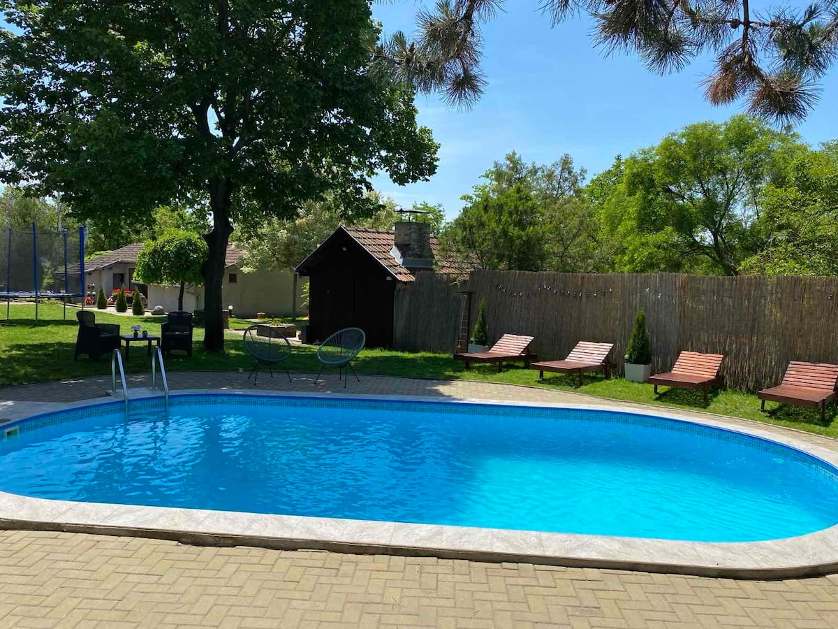 Αποκλειστικό αρχοντικό στο Dunaújváros σε ένα ήσυχο περιβάλλον. Για οικογένειες, ταξιδιώτες για επαγγελματικούς σκοπούς, επισκέπτες στην περιοχή. Οι ευρύχωροι χώροι είναι κατάλληλοι για να περάσετε χρόνο μαζί άνετα. Είναι πραγματική ελευθερία να μπείτε στο σαλόνι με την αμερικανική κουζίνα, η οποία σας καλωσορίζει το πρωί με έναν αστραφτερό ήλιο. Πλήρως εξοπλισμένη μηχανοποιημένη κουζίνα, 2 μπάνια, 4 δωμάτια με άνετα κρεβάτια σε δύο ορόφους. Τζακούζι 6 ατόμων στη βεράντα, κήπος, μπάρμπεκιου και εγκαταστάσεις μαγειρέματος, ιδιωτικό γκαράζ.