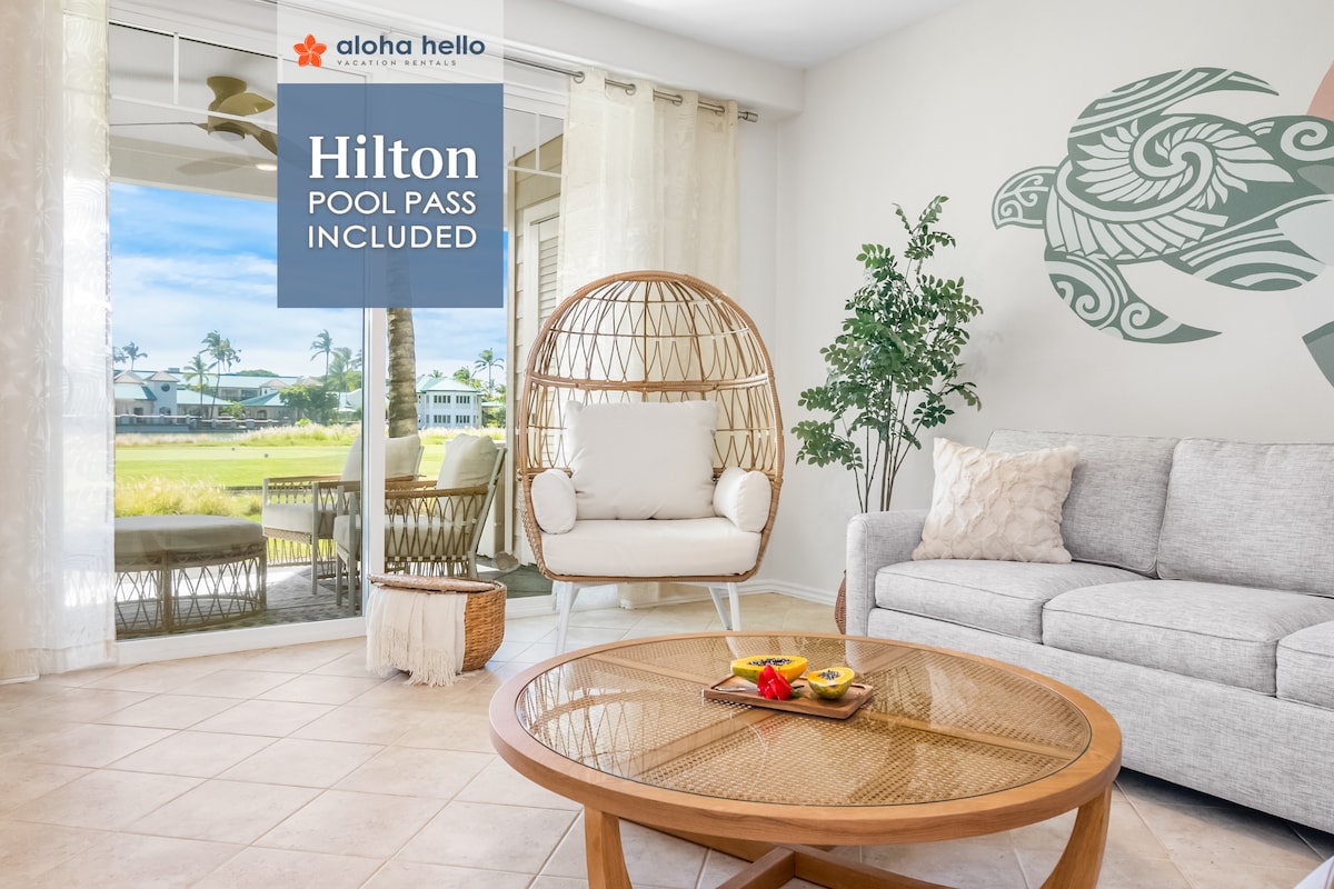 Μοντέρνες πινελιές σχεδιαστών με νησιώτικη ατμόσφαιρα θα σας συναντήσουν σε αυτήν την όμορφα αναβαθμισμένη ισόγεια μονάδα. Περιλαμβάνεται πρόσβαση στην πισίνα του Hilton. Το μεγάλο σαλόνι με ψηλά ταβάνια οδηγεί σε μια πλήρως εξοπλισμένη κουζίνα σεφ και σε μια βεράντα με άφθονα καθίσματα και θέα στο γήπεδο γκολφ, τη λίμνη, το κοντινό εμπορικό κέντρο και τα πανέμορφα ηλιοβασιλέματα κάθε βράδυ. Εξοπλισμός παραλίας, βρεφικός εξοπλισμός, υπέρδιπλα κρεβάτια, κάθε δωμάτιο διαθέτει ανεμιστήρα οροφής και κλιματισμό, στόρια συσκότισης. Θερμαινόμενη πισίνα, έναστρο ουρανό, γυμναστήριο, τζακούζι, εξωτερική κουζίνα... ιδανικές διακοπές.