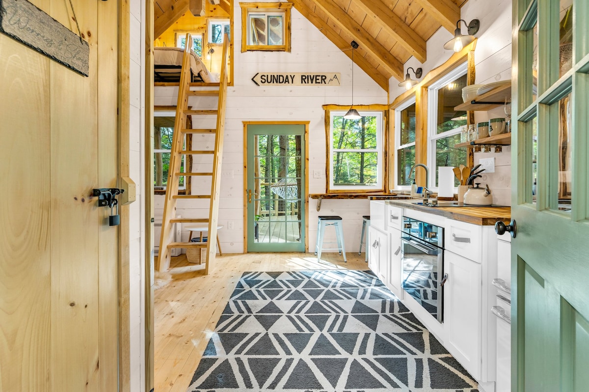 Ξυπνήστε με τον ήχο καταρρακτών ακριβώς έξω από τον γυάλινο τοίχο σας σε αυτό το ρομαντικό μικροσκοπικό σπίτι στην προκυμαία του Norway, στο Μέιν! Ιδιωτικό υδρομασάζ με θέα στο ποτάμι, διαφανές τζάκι αερίου, άνετο υπερυψωμένο διπλό κρεβάτι με θέα στο νερό, υπαίθριο ντους, αιώρες και άμεση πρόσβαση σε μονοπάτια πεζοπορίας. Απόλυτη ιδιωτικότητα—δεν φαίνονται γείτονες. Μοντέρνα κουζίνα, ενδοδαπέδια θέρμανση, γρήγορο Wi-Fi και προσεγμένες πινελιές για ζευγάρια ή αποδράσεις για ένα άτομο. Ρομαντική απόδραση κοντά στο Sunday River για σκι, γκολφ και περιπέτειες στο Μέιν. Η όαση της φύσης